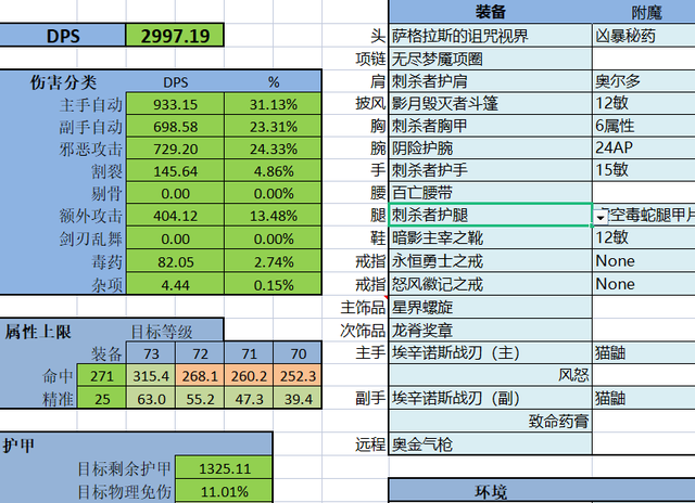 小探用Simonize_TBC盗贼数据模拟器来进行相关测试,这模拟器用来模拟盗贼DPS超棒的,差不多能重现盗贼的输出场景呢。小探给盗贼搭配了P3阶段的基础装备,在满增益、单目标的状况下,盗贼输出了4分半的时间,算下来平均每秒的伤害能有2680点。
