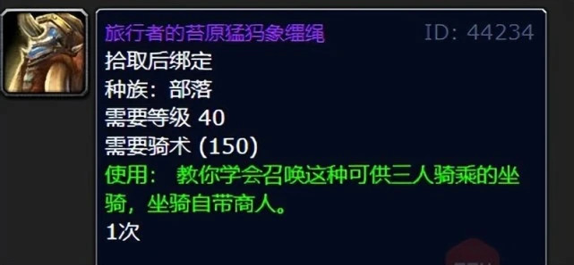 wlk版本新出了个坐骑,叫旅行者的苔原猛犸象缰绳。这坐骑卖20000金呢,价格挺高。不过长远看呀,它超值。为啥这么说呢?第一,这坐骑能修装备。不但如此,它还售卖各种各样的材料。像那些平常职业常用的材料,在这儿都能买到,这下就不用担心忘带材料的事儿了。更重要的是,不管啥时候,这坐骑都能把我们打的材料卖给商店,这样就省了回程的时间。还有哦,这坐骑是个三人座的,能把npc从座位上撵走,让自己的朋友坐上去呢。
