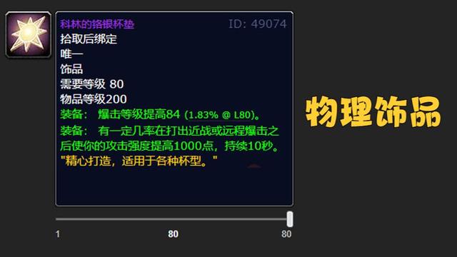 有这么一款饰品,它就是科林的烙银杯垫。它的常驻属性是84点暴击等级,触发特效的时候能有1000点攻强呢。这个特效虽说只能维持10秒,而且还有内置冷却时间,不过它的物品等级达到了200级,这和5H掉落的物品等级是一样的。要知道,在版本初期的时候,暴击属性是特别少的,所以这个饰品还是挺不错的。