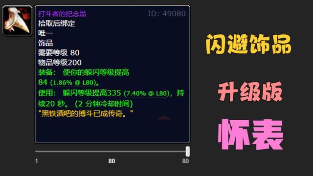 有这么一款饰品,它是属于打击者的纪念品。这个饰品有常驻属性,那就是84点的闪避等级。它还有主动特效呢,能达到335点的闪避等级,并且这个特效可以持续20秒。这个饰品的冷却时间是2分钟。