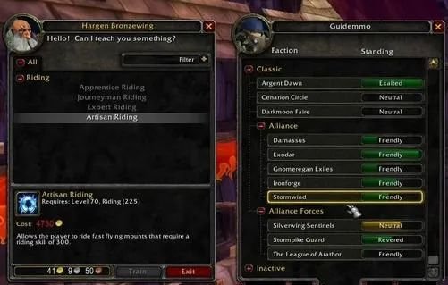WLK版本里,大鸟骑术没啥变化。其学习等级依旧是70级,价格还是5000G。但在这个版本中,声望能让骑术学习价格降低。有玩家在WLK怀旧服Beta测试服做了实测,发现暴雪在地狱火半岛的萨尔玛或者荣耀堡营地添加了飞行骑术训练师。要是奥格瑞玛或者暴风城的声望达到一定程度,还能有折扣呢。那些声望崇拜的玩家去学大鸟骑术,只要4000G就行。而且呀,小鸟骑术也有优惠价。在前夕版本开放之后,学大鸟骑术一下子就能省1000多G呢。这就好比你去买东西,原本要花5000元,因为你是老顾客(就像游戏里的声望崇拜),人家就给你便宜1000多块,只要4000元就可以买到同样的东西(这里就是大鸟骑术)。