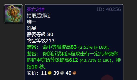 死亡之钟是第一件装备。它由25人NAXX的BOSS迈克斯纳掉落,掉落概率是4.2%。这件装备有几率让玩家获得612点护甲穿透,这一穿透数值相当于43.73%,持续时长为10秒,其内置冷却时间为45秒。在P1阶段,要是玩家拥有了死亡之钟,那他仅需435点破甲就够了,这一要求是比较容易满足的。比如说,一个普通的物理DPS玩家,在正常游戏过程中,通过一些常规手段就能轻松凑够这个数值。对于物理DPS而言,如果在P1阶段就能实现软满破的话,那他的输出能力差不多就能赶上前期输出能力优势明显的法系DPS了。
