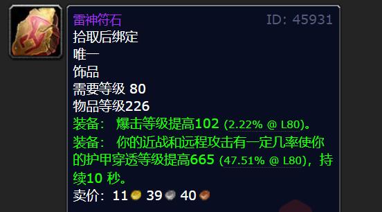 有一件装备叫雷神符石。它是从10人奥杜尔里托里姆的宝箱中开出来的,掉落的概率能达到20%呢,所以想得到它没什么太大的难度。这件装备有个特效,就是有一定的概率会得到665点护甲穿透,这个护甲穿透的比例是47.51%,特效持续的时长为10秒,而它的内置冷却时间是45秒。这个特效要比死亡之钟的效果还要强一点。