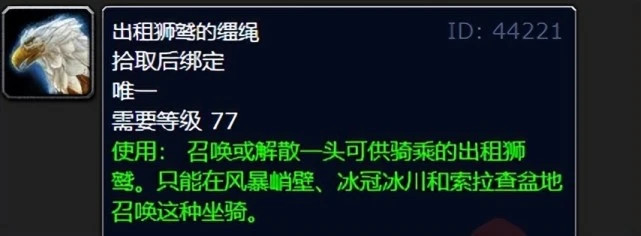 当我们的等级到了77级,如果没有金币去学寒冷飞行,那就可以前往风暴峭壁,找一个叫“诚实的”麦克斯的NPC。这个NPC会把飞行坐骑租给你。联盟的坐骑是出租狮鹫的缰绳,这是个小鸟坐骑呢。在WLK版本,小鸟坐骑的速度和TBC时期不一样了,已经从60%提升到了150%。这个坐骑能在风暴峭壁、冰川冰冠还有索拉查盆地飞行,这会让我们练级的速度加快不少。你想啊,就好比我们原本要走很长的路去做任务,现在有了这个能快速飞行的坐骑,就可以直接飞到任务地点,节省了大量时间,就像开了加速器一样,能更快地提升等级了。