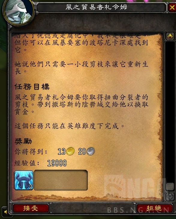 在地狱火半岛有个地方叫萨尔玛,那儿有个叫纳兹格雷尔的家伙。他身上有个任务叫“酋长的意志”,完成这个任务能得到2.53万(这里可能是某种游戏中的奖励数值,比如经验值或者金币之类的)。