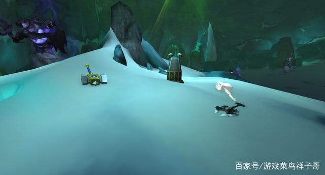 霜之哀伤洞穴里至今还留存着阿尔萨斯和穆拉丁的武器呢。大家瞧下面这张图,在冰雪堆积之处,有三把武器散落着,一把是阿尔萨斯的战锤,另外两把分别是穆拉丁的战锤和战斧。为啥穆拉丁的战锤和战斧会留在这儿呢?原来是穆拉丁被冰矮人救走的时候,没把自己的武器带走。橙斧任务会重现当年的情形,当时阿尔萨斯拿着霜之哀伤离开后,穆拉丁就苏醒了,不过他苏醒之后失忆了,所以就没拿走自己的武器。