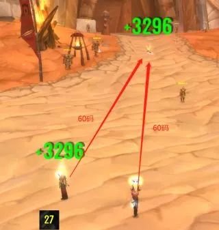 圣光道标要是能正常工作的话,得有三个人处在一个直径为60码的圆形范围里,而且这三个人相互之间不能有遮挡。圣光道标有个作用,它能把你的最远治疗距离从40码给提升到60码(就像下面图里显示的那样)。在不少场景里,就因为多出来的这20码距离,你就能做很多其他治疗做不了的极限治疗操作。比如说在大型团队战斗中,队友分散比较开,普通治疗距离不够的时候,圣光道标这多出来的20码距离就能让治疗者够到远处的队友,及时进行治疗。