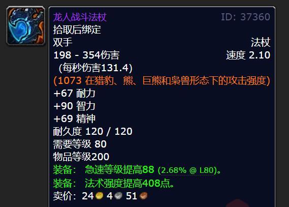 在WLK版本里,有个叫启示/启迪(分部落和联盟版本)的东西。它是从10人英雄TOC的双子BOSS那儿掉落的,掉落的概率是15%。这可是WLK版本中第一个属性超棒的法杖呢。它的物品等级是245,具备暴击、急速、法伤这三种输出属性,同时还有3个插槽。法杖的这些属性能够让法系DPS的战斗力提升很多。10人英雄TOC这个副本的难度不大,所以对于玩家来说,这把法杖在WLK中期是最容易得到的顶级BIS装备。