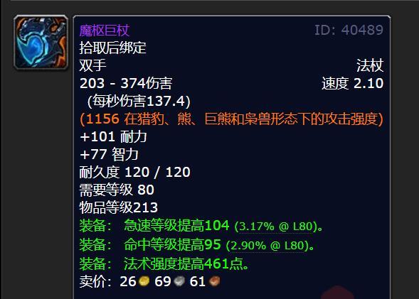 在25人的团队副本P1阶段,玩家能得到很多213等级的双手法杖。可这其中呢,只有魔枢巨杖是带有三条绿字输出属性的法杖。要知道,对于法系来说,急速属性在输出属性里排第一,而且在前期,命中属性也很难堆满。所以啊,用魔枢巨杖来替换龙人战斗法杖是很不错的选择。那魔枢巨杖从哪来呢?它是在25人永恒之眼副本里掉落的,掉落的概率大概是10%。