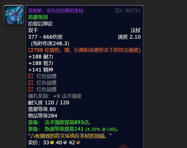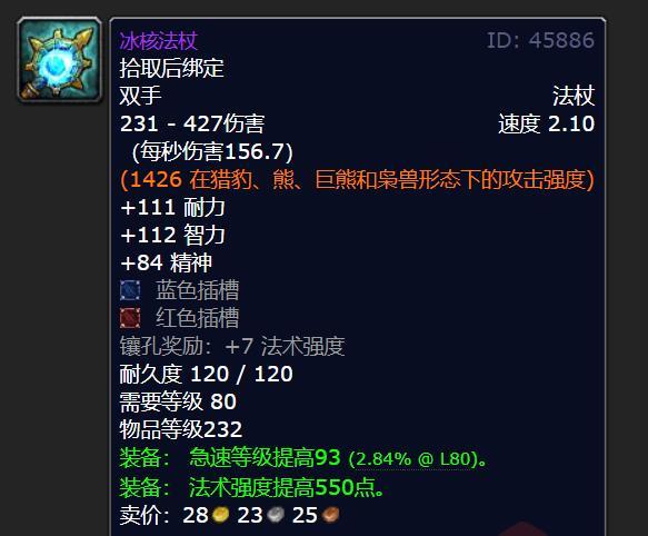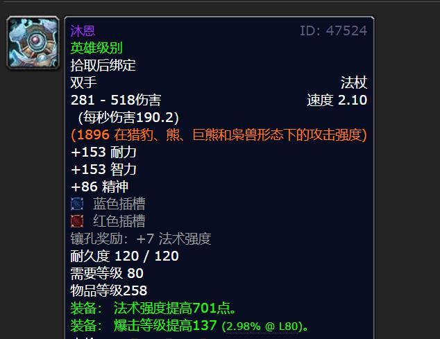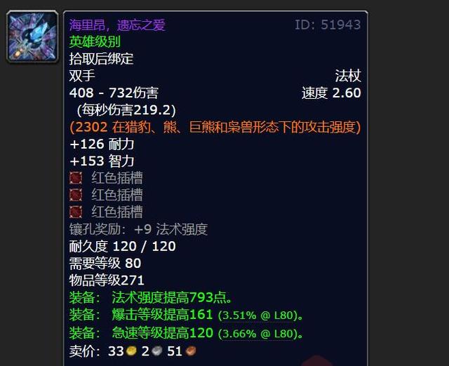遗忘之爱的双手法杖,是10人英雄巫妖王掉落的。在10人的小团体里,这可是能拿到的最好的法系装备了。它有着很棒的急速暴击属性,还带3个红色插槽呢。10人巫妖王可不好对付,能把这法杖拿到手的玩家,那可都是顶尖的精英啊。