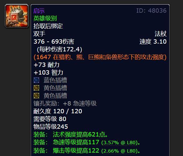 启示法杖有着原始萨满教那种社交风格,看起来特别粗犷、野性,小探觉得这对萨满和鸟德来说很实用。还有啊,10人英雄TOC会掉落一把245级别的法杖,叫覆亡/凝霜。可这把法杖跟启示法杖比起来,少了一个插槽呢,所以只能把它当作次选。