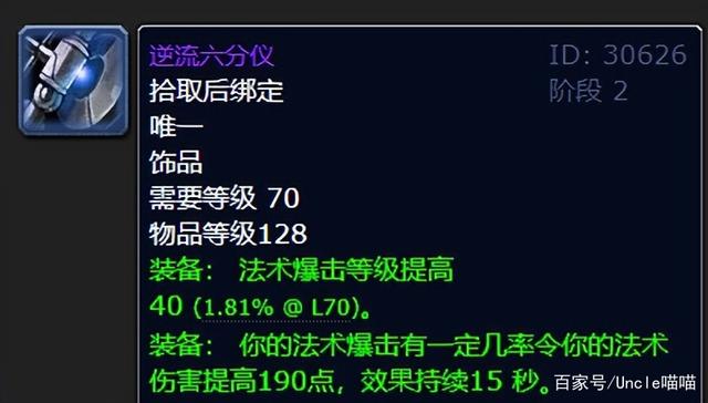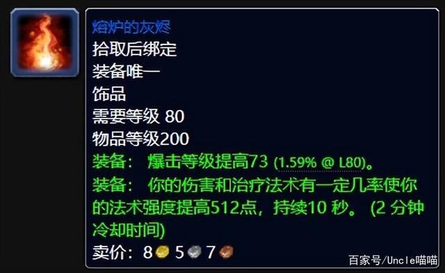 对于那些特别需要法术暴击的法系输出职业而言,这东西相当不错。我个人觉得,像元素萨满或者火法,都可以把它拿下,它在前期算是很不错的饰品。它触发之后,持续时间仅有10秒,不过能提升512点法术强度,这可相当厉害,就像经典饰品大号逆流六分仪似的。