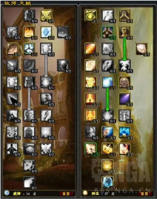 神牧的天赋会因流派差异而有三个不同的走向。在这里,我要给大家推荐通用性最佳的14/57天赋。(在后面讲述副本细节的时候,我还会推荐最契合那个副本的天赋哦。)具体的天赋就像图里展示的那样。
