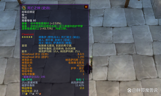 这款饰品掉落难度不高,在NAXX里有4个BOSS会掉落它,像迈克斯纳、收割者戈提克、肮脏的希尔盖还有格罗布鲁斯都会掉。以前运气好的时候,下一趟副本能掉2个呢。由于它掉落得多,随着时间推移,这饰品的价格就会很快降下来。普通玩家不妨先让土豪拿。