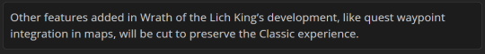 不管怎样,就现在怀旧服设计团队的想法而言,他们所做的一切都是想让玩家能体验到巫妖王系统最初的3.0版本。像随机副本和任务导航这些机制,是到WLK(巫妖王之怒)末期才被加入游戏的,在WLK怀旧服里不会被使用。