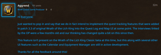 社区玩家最近对任务导航功能的反应特别强烈,暴雪可能是受此影响,今天早上又发了新的蓝帖。暴雪在蓝帖里说:“之前的采访都是好几个月以前的事了,现在我们的想法又变了些。WLK怀旧服Beta版里没有任务导航功能,不过我们已经在努力开发这个功能了。”
