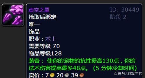在P2阶段,之前提到的那些问题都会被轻松解决。之前讲过2T5套装的效果,这一效果能极大地增强魅魔的持续作战能力。还有风暴要塞中的虚空之星职业饰品,它能提升魅魔的抗秒杀能力。虚空之星呢,它有一个开启后能带来增益效果(BUFF)的功能,这个功能的冷却时间(CD)是5分钟,一旦开启就能给人物增加48点法伤,给宠物增加130点全抗性。只要在这5分钟内魅魔没有死亡,那这个增益效果就跟一直存在一样。这个饰品其实就是牺牲一定的输出爆发能力来保障魅魔的生存能力,玩家可以依据不同的BOSS情况来决定是否使用它。