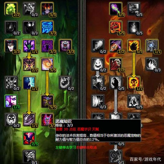天赋点法是这样的。恶魔系点到40的时候,可以出恶魔战术和恶魔知识。因为恶魔战术没点满,所以当人物和宠物都满BUFF的时候,面板暴击大概能提升2%,法伤能提升130点。恶魔知识呢,是依据宠物的属性来提供法伤的。这么一来,团队的BUFF还有各种卷轴加成,不但能让魅魔的输出提高,也会间接提升你的面板数值。 再说说毁灭系,要在这个系里点出21点,要点暴击伤害和强化魅魔,这样就不能点大哥了。为啥呢?因为毁灭天赋里暴击伤害所带来的提升,要比把大哥换成魅魔的提升高得多。打个比方,如果把大哥换成魅魔,可能只提升一点小属性,但是暴击伤害提升后,可能在战斗中的伤害输出一下就高了很多,这差距就很明显了。