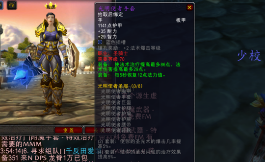 小探要给大家推荐一下圣骑士的T6套装选择。小探建议大家选用T6的头、肩、腿、胸这几个部位的装备。手套呢,就用波涛荣耀护手吧,别选没有法术暴击的T6手套啦。光明使者头的智力要比命运皇冠多出10多点呢。综合各种情况来看,放弃命运皇冠而选用波涛荣耀护手(这个护手是瓦斯琪掉落的)是最好的选择。 奶骑的2T6已经相当厉害了。在打败阿克蒙德之前,可以先拿命运皇冠(这是三脸掉落的)来过渡一下。就像在很多团队作战场景中,前期装备还不齐全的时候,有一件差不多能用的装备过渡是很常见的做法。命运皇冠虽然不是最佳选择,但在这个阶段也能满足一定的需求,就像很多玩家在前期没有更好的装备时,会先将就着用它来提升自己的能力,等到有更好的装备再进行替换。