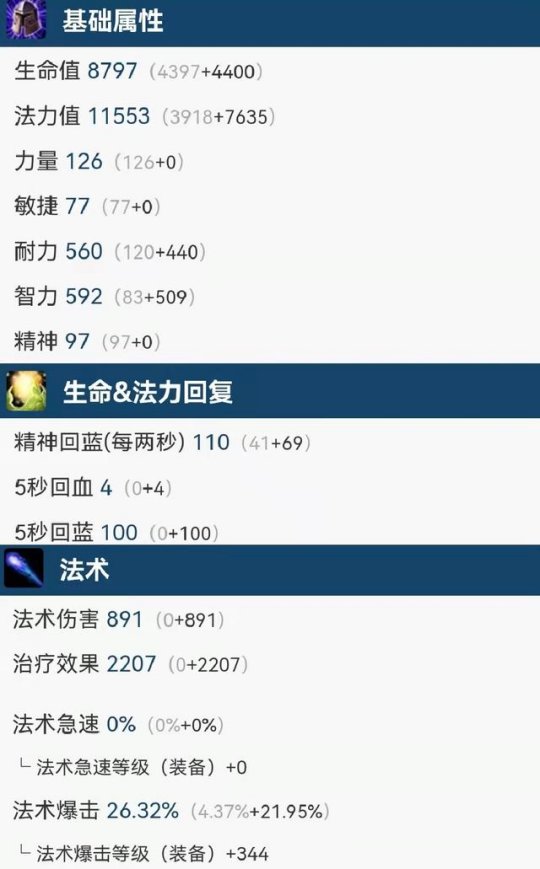 奶骑还会额外得到11553点蓝量呢。要是宝石选用10智力的,蓝量能增加1000点,法术暴击也会降低1.3%。此外,奶骑能获取2207点治疗效果,还有100点的五回。