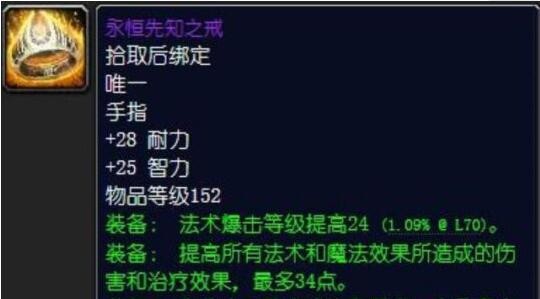 有两枚戒指可供选择。一枚是“永恒先知之戒”,这个戒指包括永恒系列以及它后续升级到完全体形态的版本,这枚戒指是固定不变的,哪怕它前期还没有进化完全,你也能用。另一枚戒指就因人而异了,从众多戒指里看,远古知识戒指或许是最好的,但要得到它竞争特别激烈。在这种情况下,“风暴掌控之戒”是个很不错的选择,它非常实用。要是你担心自己的蓝量不够,那卡拉赞声望崇拜得到的130戒指就可以继续用,我觉得这么做没什么问题。