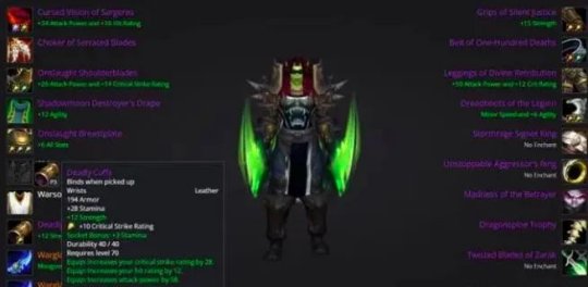 海山的老一BOSS会掉落一件致命腕甲。拿它跟板甲护腕狂暴镣铐相比的话,致命腕甲的属性要好一点,而且它还有命中属性呢。不过,得等到太阳井的T6护腕出来,才会考虑换掉它。实际上,这件皮甲的属性并没有特别出众,只是在P3阶段,物理职业找不到更好的物理护腕了,所以只能选它。好在这是海山一号BOSS掉落的装备,打这个BOSS特别容易,就像白送一样,那价格肯定也便宜呀。 还有一件皮甲胸甲,叫午夜胸甲,是阿克蒙德掉落的。这午夜胸甲的副属性挺高的,可它的主属性就只有耐力,这就占用了不少的物品等级。要是不穿4T6的话,就只能选这件皮甲胸甲了。它的综合属性和T6胸甲差不多。盗贼的人数相对来说不算多,所以这件装备的竞争不会很激烈。这是美服的一个战士给自己搭配的BIS装备,这里面的4件皮甲,一件都不能少。但要是你更喜欢板甲,或者想要凑齐4T6的话,那也可以调整一下搭配。