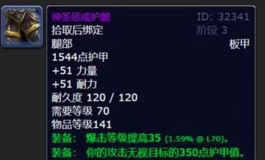 别买眼罩和午夜胸甲啦,改而用上血沸掉落的神圣惩戒护腿吧,其余部位就用套装。这么做的话,破甲的数值会比较高,力量也能有很高的数值,得到王者祝福时收益相当大。不过呢,这样做有个缺点,就是暴击会损失不少,而且命中也变得不够了。