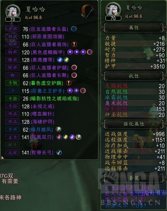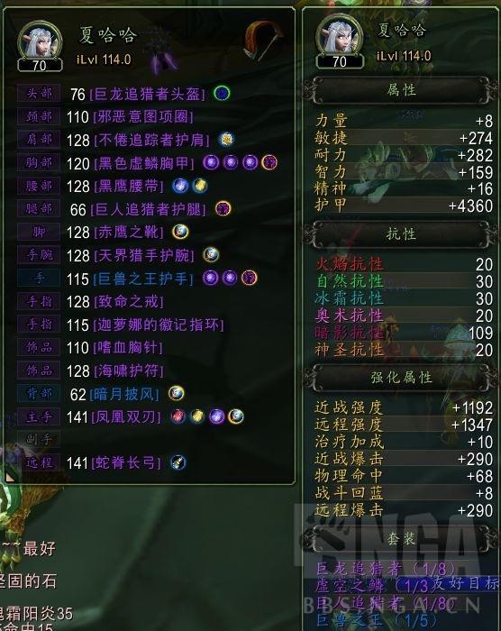 我叫法琳娜,是个猎人,从60级的时候就开始玩这个游戏了。我把以前的套装都留着呢,为啥呢?因为我们团队要去开荒海山和黑庙,团队要求大家配置能有150以上暗抗的装备。我突然发现啊,以前的T1和T2套装有不少暗抗属性呢。于是我就把以前那些有暗抗属性的装备全都穿上了,想看看效果咋样。就像下面图片里显示的那样。