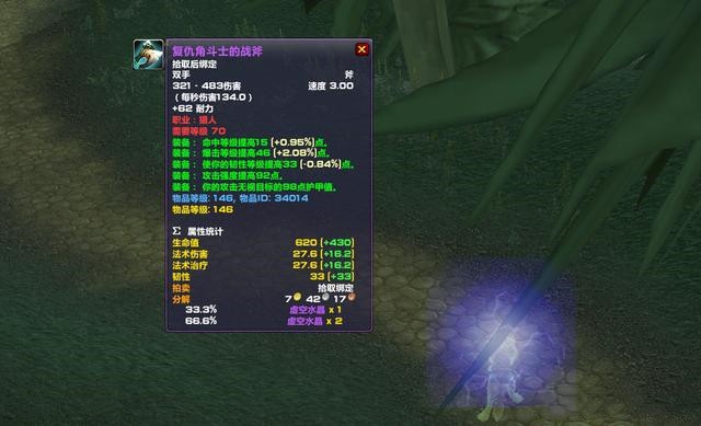 复仇角斗士的战斧,这装备等级有146呢。它带的属性可不少,暴击和攻击强度数值都挺高的,而且还有命中和破甲属性。对于猎人来讲,这些属性都特别关键。要是再用上磨刀石的话,就属性收益而言,它可不比凤凰双爪差。