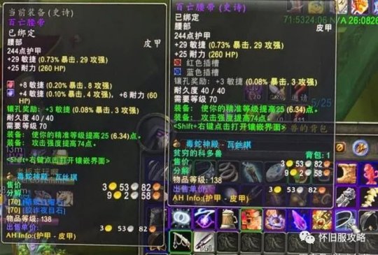 百亡这件装备,是用到SW(太阳之井高地)的精准装,它的重要性大家心里都清楚。近战职业得想尽办法把它拿到手,哪怕花3万金币也不算多。要是你觉得我这是故意抬高价格,那你大可不买,不过到了P3阶段,你肯定会后悔的。 除了百亡腰带,剩下的4件装备就不用花太多钱了。大概2000金币就能拿下,就像P(可能是指购买,这里不太明确,推测是这个意思)价一样。 毒蛇神殿的海度斯会掉落冷漠者护肩。这是敏捷皮甲,还有红色插槽,攻击强度挺高的。但美中不足的是,它的精准只有10点,感觉就像是装等被暴击这个属性给分走了一部分似的。这个护肩买不买得看你的配装情况。假如你想凑4T5套装,那就不用拿这个护肩了,可以换下面的皮甲手套。