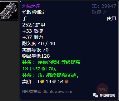 风暴要塞老一掉落的灼热之握,可比卡拉赞的精准皮甲强多了。它们的攻强都挺高,可灼热之握的精准属性有18点呢。要是职业穿着4T5套装,那就可以把手部装备换成这个皮甲,来凑精准属性。一般来讲,对灼热之握和冷漠者护甲感兴趣的,基本上就是盗贼和狂暴战。一个团队最多也就带3个输出战贼。现在副本还没削弱,近战带得少,所以这个时候赶紧把灼热之握拿到手比较好。不过出价的时候可别太高了,毕竟到P3阶段就有可以替换它的装备了。