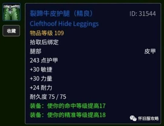 最后一件精准装备还是皮甲,就是刀锋山摊牌系列任务给的最终奖励——裂蹄牛皮护腿。它的属性有力量、敏捷、耐力、命中,还有18点精准,这蓝色裤子相当不错,比P1阶段很多紫装都要好,是配装时可以用的替代品。在虚空风暴叛徒徽记任务里,有件类似的装备叫沙塔斯护腿,这也是109装等的蓝色皮甲,属性是力量、敏捷、耐力,没有命中,但有22点精准。整体上看,沙塔斯护腿是不如裂蹄牛皮护腿的。当下的近战精准装备有5件套,不需要把这5件都拿到手,不过按照配装的要求,至少得有个两三件(其中百亡腰带很关键),这样才能进海山和BT团本。比如说,有的玩家可能有了百亡腰带,再搭配上裂蹄牛皮护腿,其他的精准装备就可以根据自己的实际情况选择了,这样的配装就比较合理,能满足进入团本的基本要求。