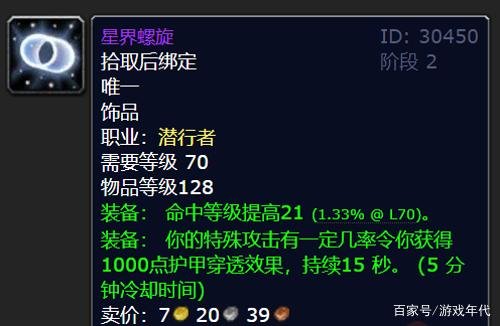 星界螺旋这玩意儿,它有21点命中等级是常驻的。它的特效呢,就是你用特殊攻击,这里说的特殊攻击也就是伤害技能啦,这么一用就能触发一个效果,啥效果呢?能让破甲达到1000,而且这个破甲效果能持续15秒。这装备乍一看啊,对面板的加成好像不咋大。你看龙脊还有嗜血胸针,那可不一样,一触发效果,攻强和急速就大把大把地加,这DPS肉眼都能瞅见蹭蹭往上涨。不过呢,1000破甲这个特效在整个TBC时期可牛得很。要是你所在的团队没有那种鲁莽诅咒减甲的话,那这个星界螺旋对盗贼的提升啊,稳稳地超过龙脊。