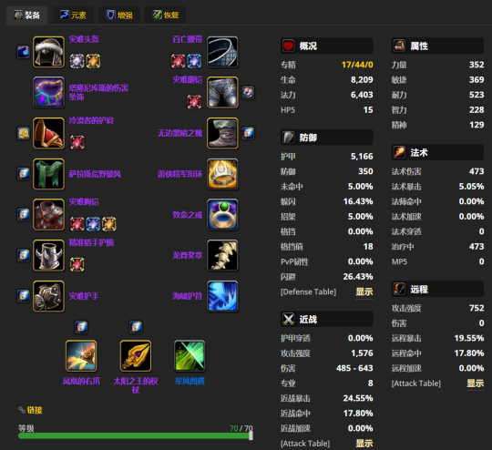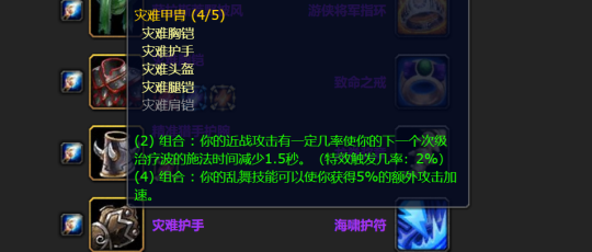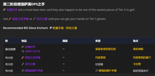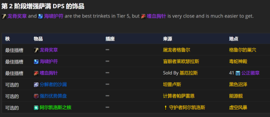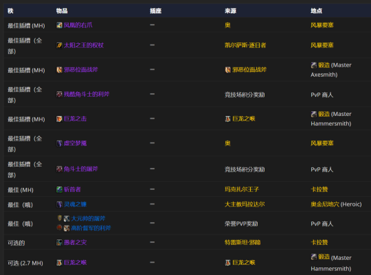 在理想的状况下,您得用上四件T5装备,这样才能拿到厉害的4件套装奖励。其他下面列出来的选项也挺不错的,毕竟有不少部件的属性数据都非常接近,不过4件套奖励还是很值得去拿的。就拿兽人来说吧,无情角斗士的利刃能让他们受益不浅,这可是很棒的武器呢。所以啊,去参加竞技场的PvP对战来获取角斗士的武器是很有意义的。还有个事儿得提一下,现在角斗士的利刃不需要评级要求了,用Arena积分就能买到,而且积分还有折扣呢,这么一来,这武器就更容易拿到手了。下面就是一组装备的示例,这里面每个插槽都有最好的部件,而且整体的命中上限近乎完美,能达到5%。
