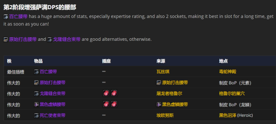 在魔兽世界TBC怀旧服里,到了P2阶段,增强萨该怎么配装呢?我想给大家介绍一下WOWHEAD上P2版本增强萨的相关内容,像BIS装(最佳装备)、备选装,还有宝石和附魔的选项。这能给大家在P2阶段增强萨的装备配装方面提供一些推荐,希望对大家有帮助呀。