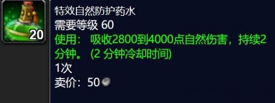 TBC新版的抗性药水里面有特效自然防护药水。这种药水能够吸收2800至4000点自然伤害呢,在瓦斯琪的P3阶段它可是主要使用的药水。