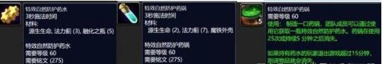 你有没有一种又回到了NAXX时期那种人人都是抗性药罐子的版本的感觉呢?在测试的时候,服药水是免费的,可以随便吃。不过,怀旧服里特效自然防护药水的成本可不低,1个源生生命加上3个法力蓟只能做出5瓶特效自然抗药水。还好,TBC版本多了抗性药锅,2个源生生命和7个法力蓟就能够制造出容量为25瓶的自然防护药锅。打个比方来说,就像你要准备一场艰难的战斗,特效自然抗药水就像珍贵的小补给,数量少且制作成本高。而抗性药锅则像是一个大补给箱,用相对多一点的材料就能制造出大量的防护药水。