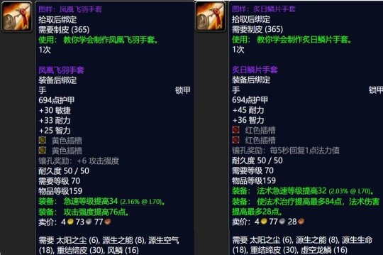 SW里制造业出的破甲手套只有永生幽暗手套这一双。像盗贼、狂暴战这类物理DPS在初期的时候都得要这双手套。板甲和锁甲职业到了后期呢,能去换基尔加丹掉落的164破甲手套。皮甲职业就没这么好运了,他们只有穆鲁掉落的159急速手套。奶德的手套就不用多提了,小怪掉落的手套拿来用就挺不错的。
