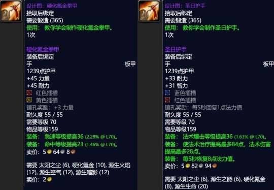 有两款板甲手套,它们的定位就跟锁甲似的,挺尴尬的。在物理属性方面,这两款板甲手套比不过永恒幽暗。就拿惩戒骑来说吧,我对这个不是特别了解,不过狂暴战要是用这两款板甲手套肯定不咋好。这两款板甲手套呢,是有暴击属性的,对于奶骑来说挺合适的。但是啊,要是考虑性价比的话,就差得远了,小怪掉落的锁甲急速治疗手(还得转化一下)比这两款板甲手套划算多了。