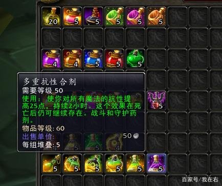 特效魔法抗性药水包含冰霜、暗影、神圣、自然、火焰、奥术这几种类型,它能够吸收2800 - 4000点伤害。在TBC(燃烧的远征)版本中有锅(可能是指某种游戏机制或者道具)的存在,这就使得抗性药水的价格很难上涨。要知道,在60年代那种天价的抗性药,到了这个时候就不会再出现了。