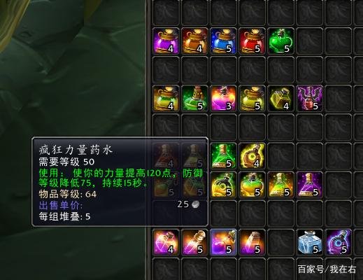 有一种叫疯狂力量药水的东西,它能让力量提升120点,不过呢,防御等级会降低75点,这个效果会持续15秒。这种药水对战士来说比较适用。战士里有个叫狂暴战的类型,对于他们而言,加速药水那是肯定要用的。