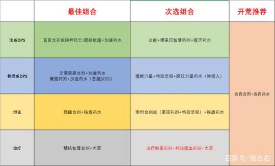 就照着这个表格吃,肯定不会出错的。开荒的时候啊,大家最好都去吃合剂,为啥呢?因为就算灭团了,也不会觉得太心疼。TBC怀旧服的副本难度呢,是从2.0版本才开始的,这就意味着前期开荒的时候会特别艰难。比如说吧,可能有些副本里的小怪血特别厚,攻击力还高,一不小心就容易灭团,所以吃合剂来提升自身属性就很有必要了。