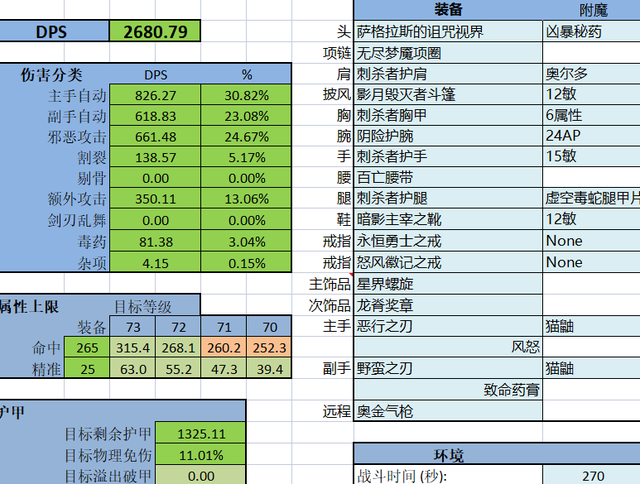 小探用Simonize_TBC盗贼数据模拟器来进行相关测试,这模拟器用来模拟盗贼DPS超棒的,差不多能重现盗贼的输出场景呢。小探给盗贼搭配了P3阶段的基础装备,在满增益、单目标的状况下,盗贼输出了4分半的时间,算下来平均每秒的伤害能有2680点。