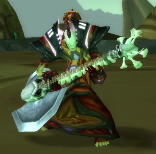 仔细瞧这把武器的话,我们就能发觉,它实际上是一把骷髅吉他造型的武器,并且跟牛头人酋长乐队里的亡灵NPC伯格里斯特所使用的武器同款。