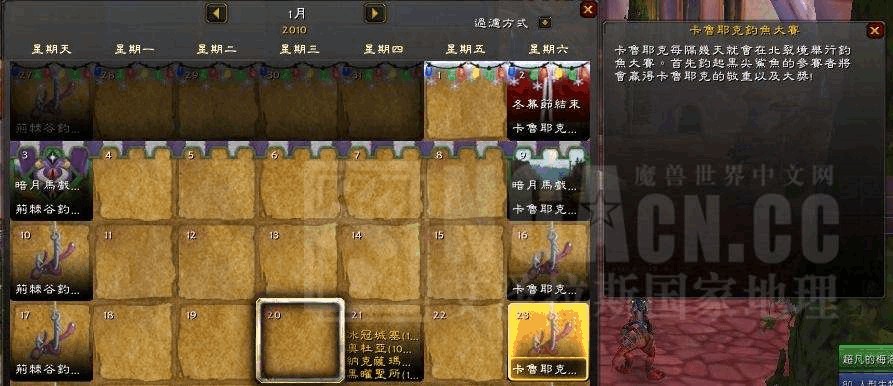 《魔兽世界》的“巫妖王之怒”(WLK)。今天呢,想给大伙讲讲游戏里卡鲁亚克钓鱼大赛的时间。有些小伙伴还不知道这比赛啥时候举行呢,下面我就把具体的时间内容给大家说说。