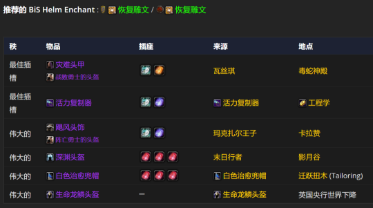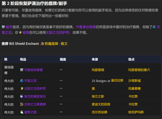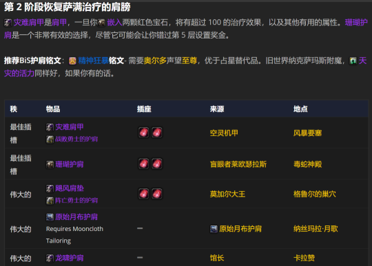 在第2阶段呢,大部分套装依旧是最优选择。不过,也有少数套装是有替代品的。要是条件允许的话,您得用T5的头和肩膀部件,再配上能找到的最好的替代装备。其实,使用下面罗列的其他选项也挺不错的。为啥这么说呢?因为有不少部位的装备,它们的统计数据都非常接近,而且啊,我们的第5层套装奖励也不是特别厉害。
