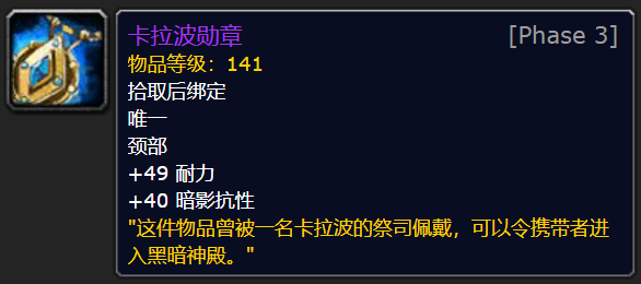 我们去协助阿卡玛奥尔多和占星者的军队,这会吸引伊利丹的注意力。趁这个机会,我们就能掩护阿卡玛和玛维·影歌从地下通道潜入黑暗神庙。完成这个任务之后,我们可以得到一条超级厉害的项链,就是卡拉波勋章。这个勋章有着49点耐力和40点暗影抗性,它还是进入黑暗神殿的关键之物呢。