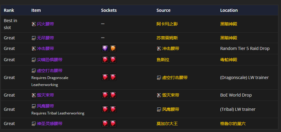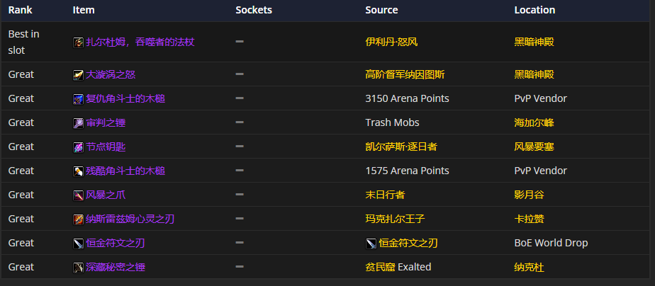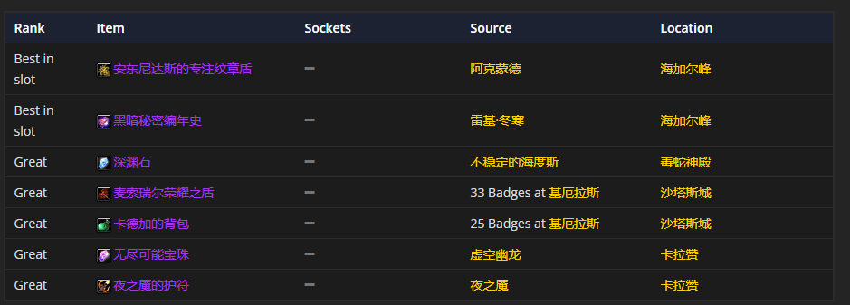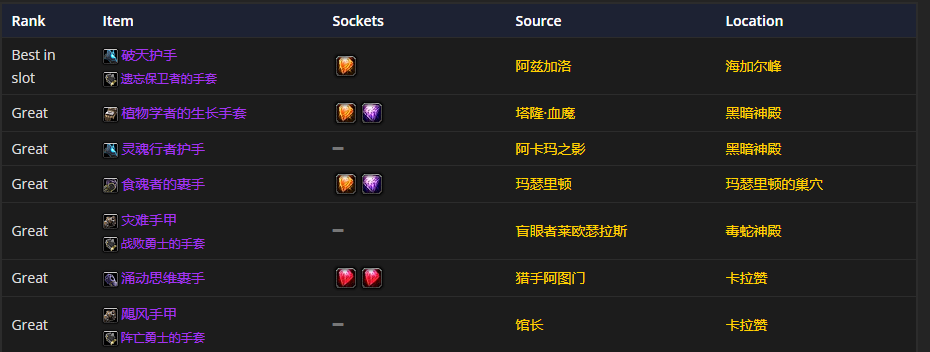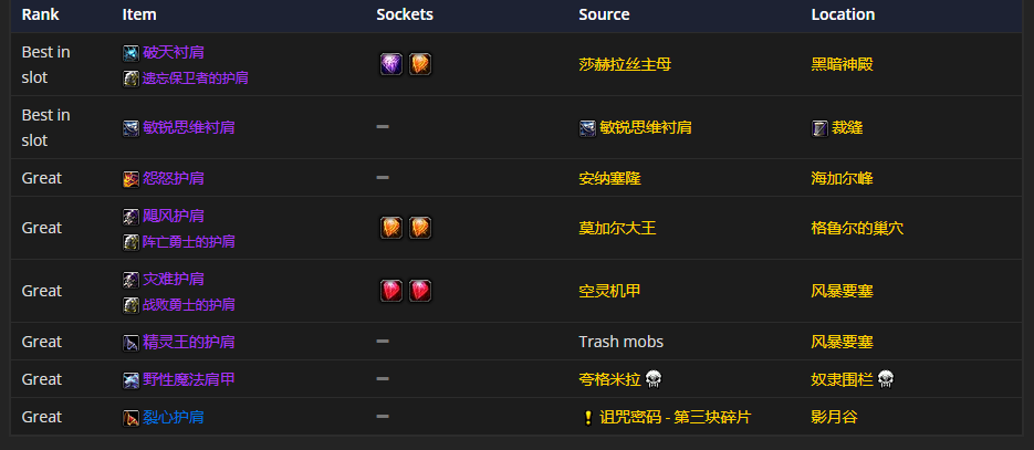 肩部装备的话,破天肩衬和遗忘保卫者的护肩是首选。至于附魔嘛,强力戒律铭文是比较推荐的。
