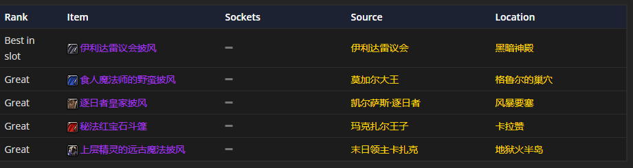要是挑披风装备的话,伊利达雷议会披风是首选哦。至于附魔嘛,推荐附魔披风 - 狡诈、法术穿透。