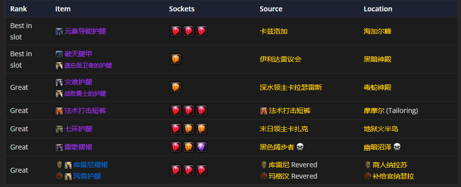 腿部装备首选元素导能护腿,附魔推荐 符文魔线